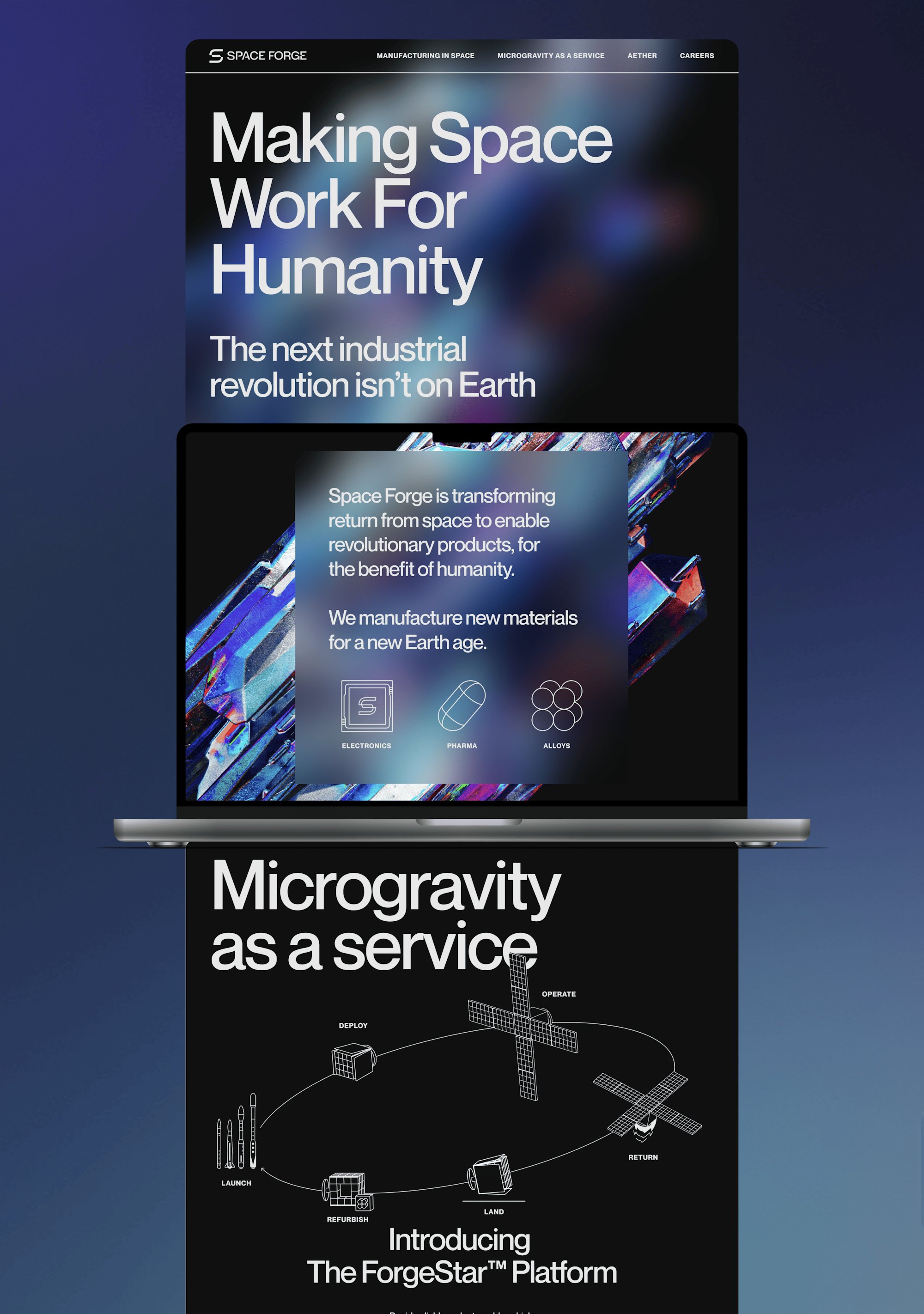 As the mysterious becomes tangible, this transformation is visually expressed through holographic treatments applied to photography, satellite imagery, and ethereal gradient backgrounds. Together, these elements create a captivating visual language that communicates the awe of discovery and the cutting-edge science behind Space Forge.