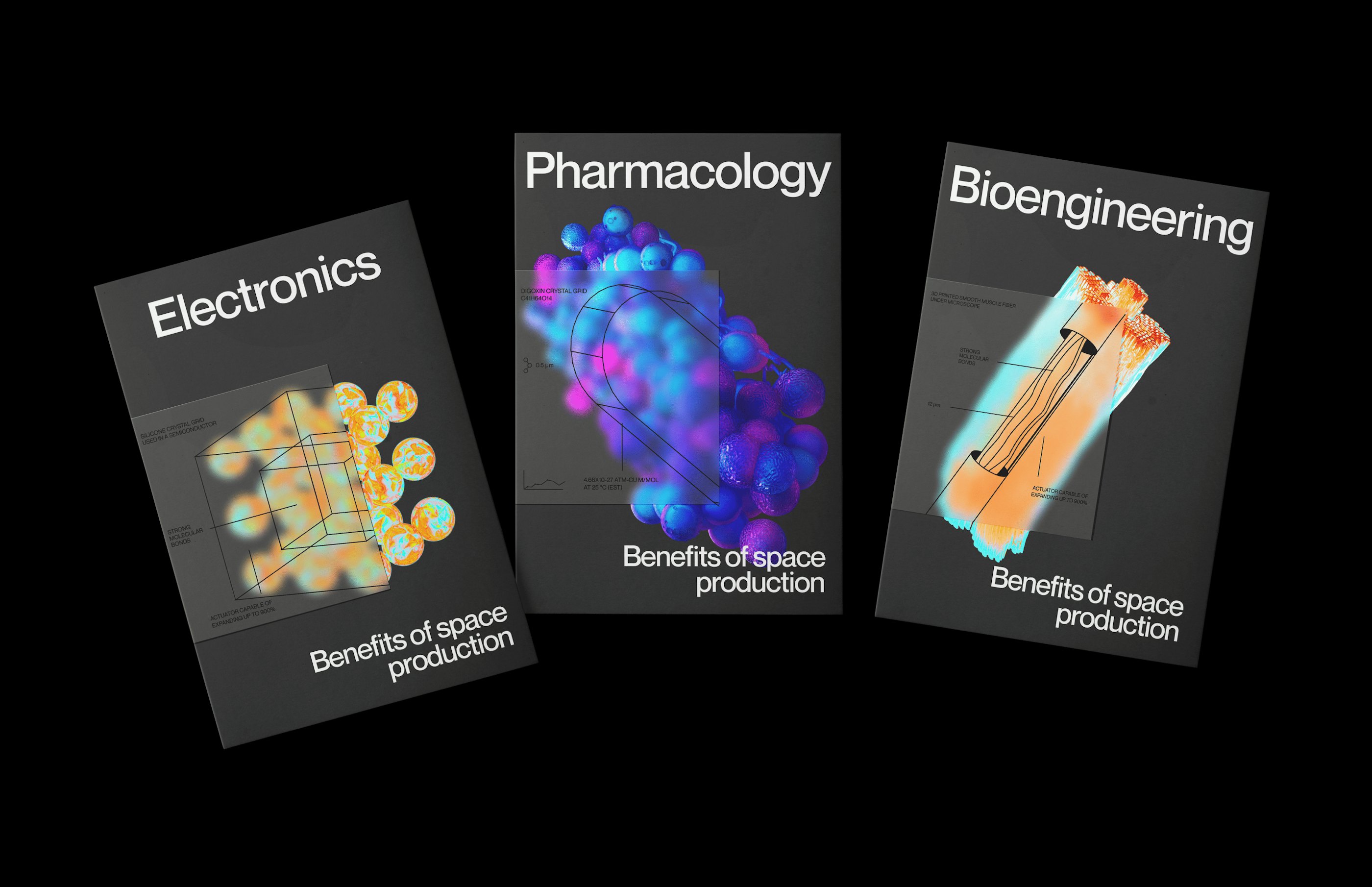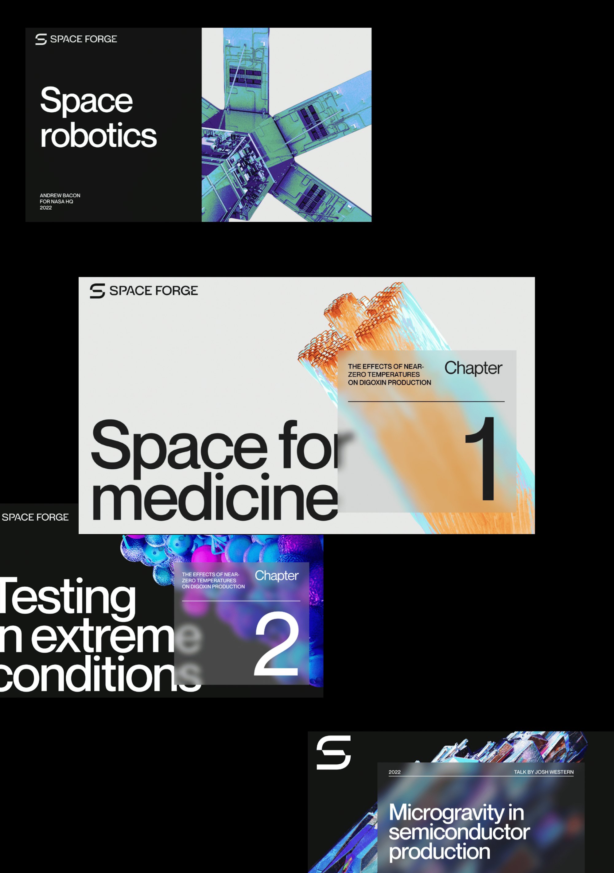 The visual identity for Space Forge is built upon a layered system that mirrors the complexity and wonder of space exploration. At its core lies a foundation of technical data, overlaid with a semi-transparent screen that evokes the blurred boundary between the known and the unknown. This is complemented by a series of otherworldly, holographic macro visuals—representing the advanced materials now possible to grow in space.
